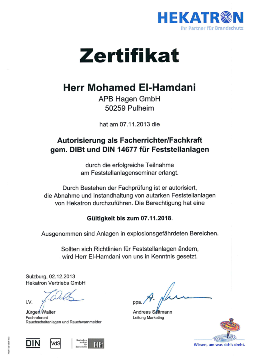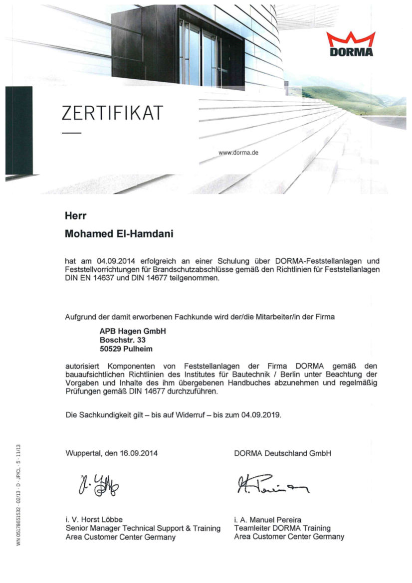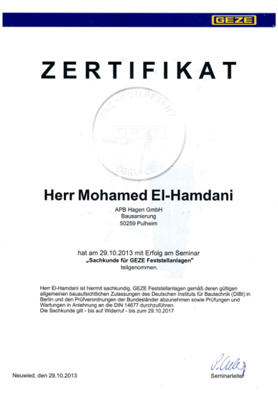 Wir sind zertifiziert Feststellanlagen abzunehmen gemäß der gültigen bauaufsichtlichen Zulassungen.